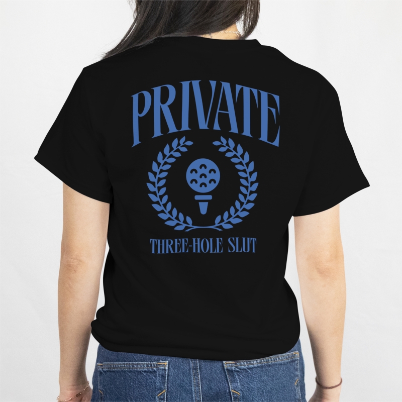 DTF Bügelmotiv „PRIVATE THREE-HOLE SLUT“ – freches Golf-Design mit Lorbeerkranz