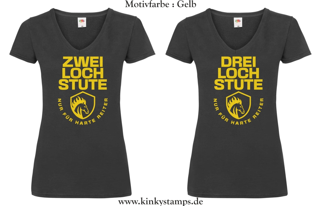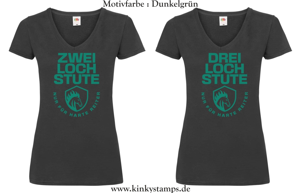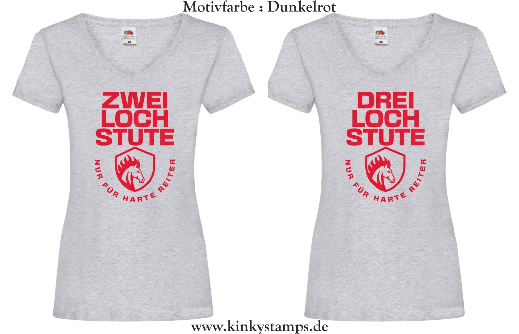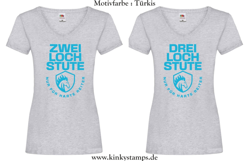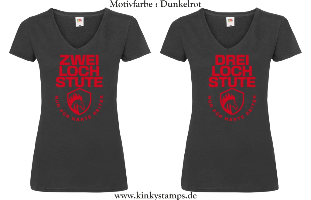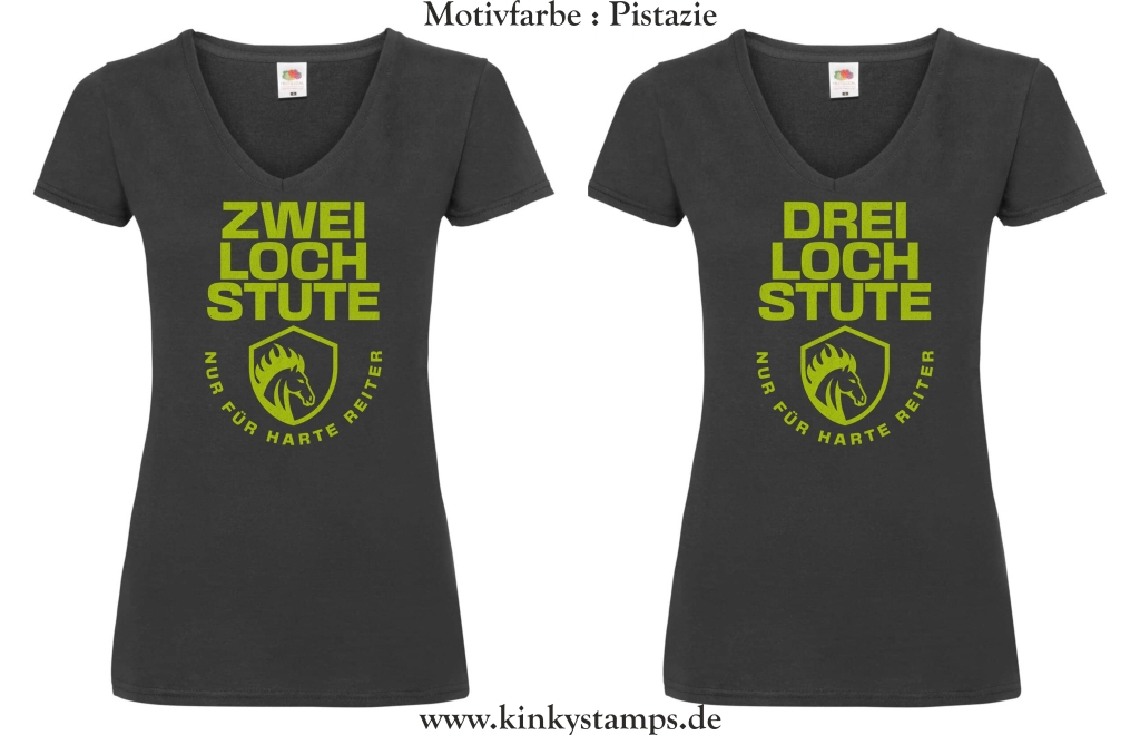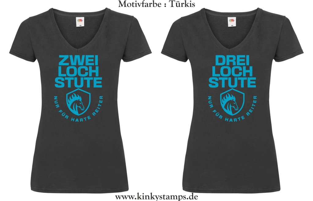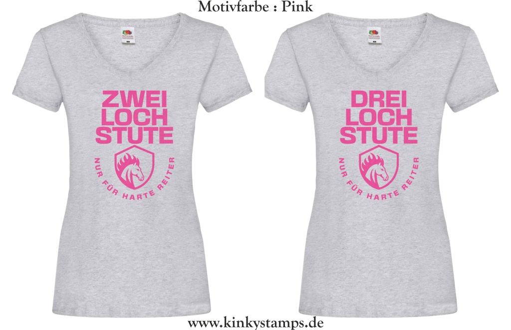 Dieses Damen T-Shirt mit V-Ausschnitt ist gemacht für alle, die ihre kinky Seite mit Stolz zeigen. Mit den provokanten Sprüchen „Zweiloch Stute für harte Reiter“ oder „Dreiloch Stute für harte Reiter“ sendest du eine klare Botschaft – ohne Umwege und garantiert mit Blickfang-Garantie.
