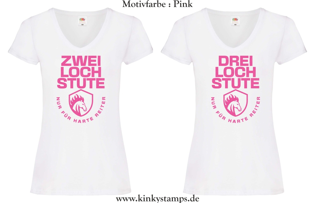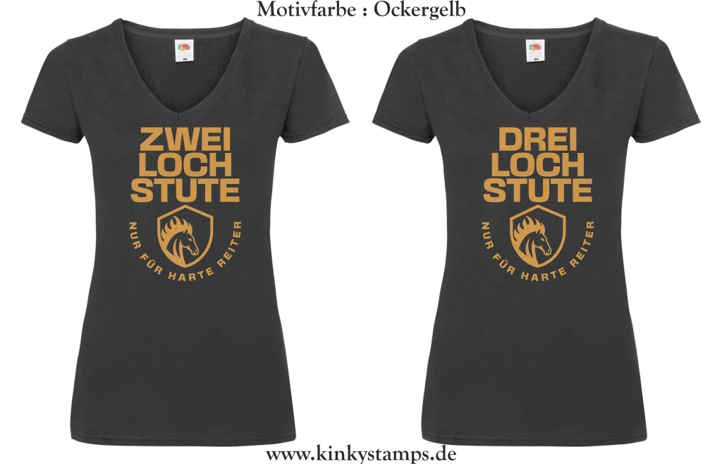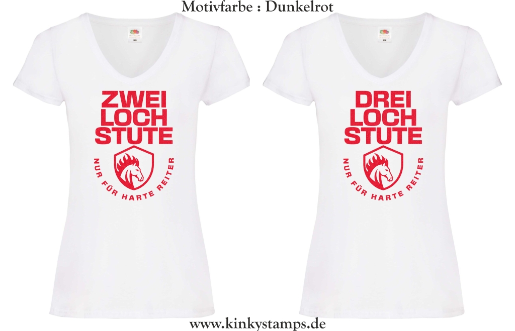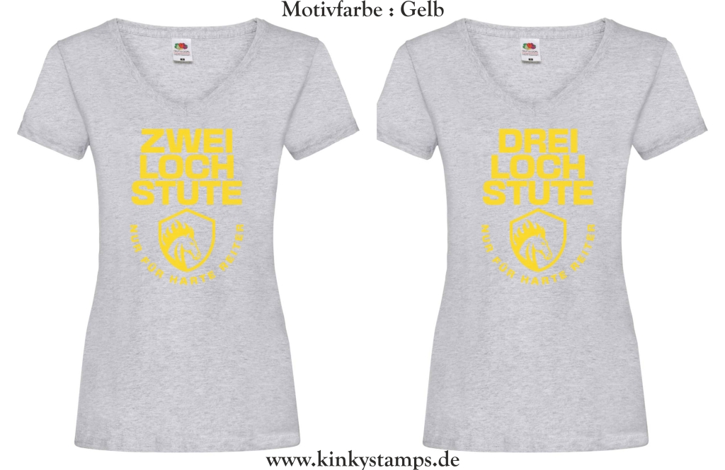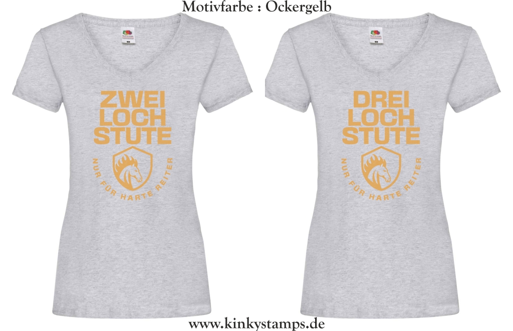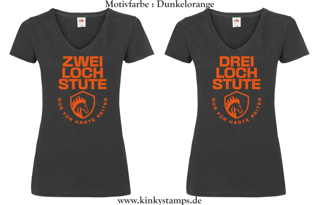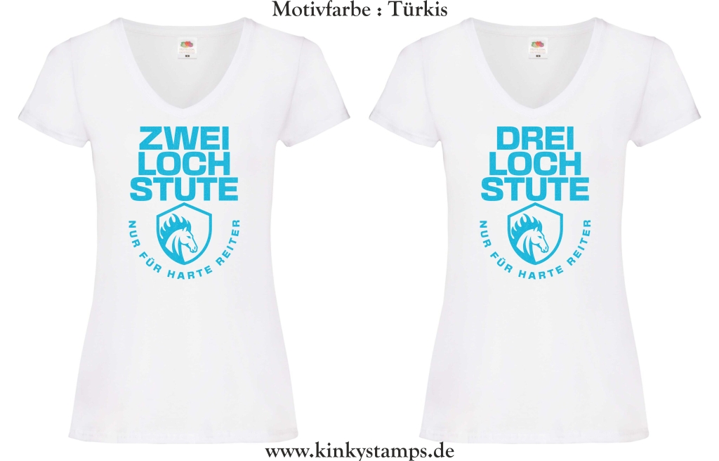 Dieses Damen T-Shirt mit V-Ausschnitt ist gemacht für alle, die ihre kinky Seite mit Stolz zeigen. Mit den provokanten Sprüchen „Zweiloch Stute für harte Reiter“ oder „Dreiloch Stute für harte Reiter“ sendest du eine klare Botschaft – ohne Umwege und garantiert mit Blickfang-Garantie.