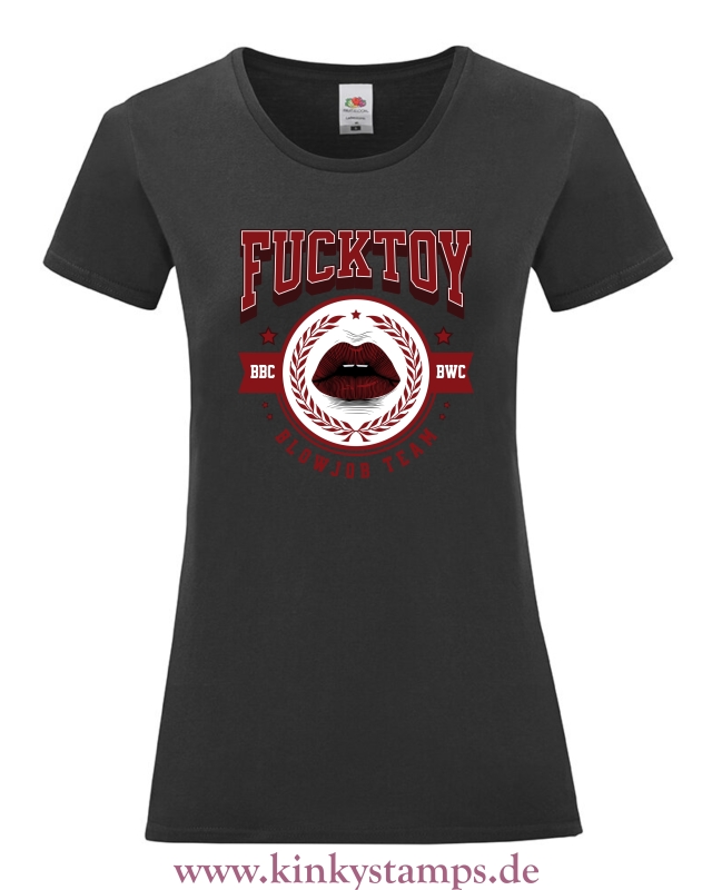Dieses Damen T-Shirt mit klassischem Rundhalsausschnitt ist ein provokantes Fashion-Statement für selbstbewusste Frauen. Der Spruch „Fucktoy - Team Blowjob“ ist im auffälligen College-Stil gestaltet und wird durch ein sinnliches Mundmotiv ergänzt – rote, geschminkte Lippen, die das Design sexy und verspielt abrunden.