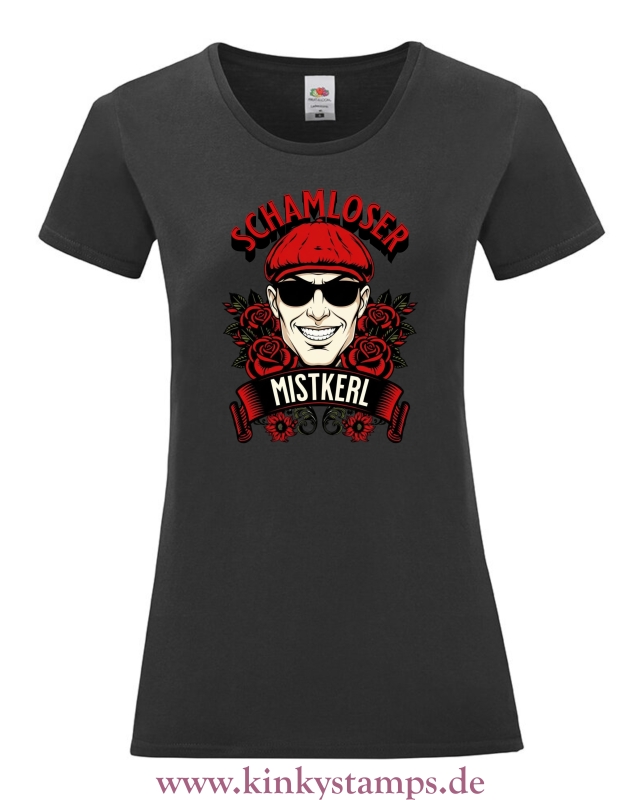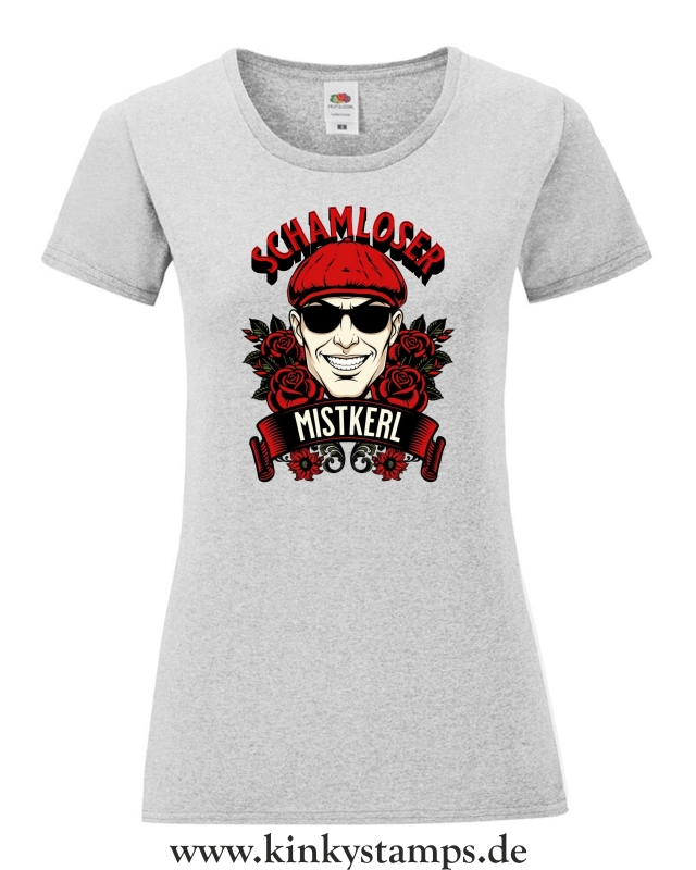 Provokant, frech und mit einer charmanten Portion Humor: Dieses Damen T-Shirt mit rundem Ausschnitt trägt den auffälligen Spruch „Schamloser Mistkerl“ und sorgt damit garantiert für Aufsehen. Zwischen den Textzeilen lacht ein grinsender Männerkopf mit Mütze hervor – selbstbewusst, schelmisch und ein bisschen dreist. Abgerundet wird das Motiv durch einen Strauß roter Rosen, der dem Design eine freche Note mit einem unerwartet romantischen Twist verleiht.