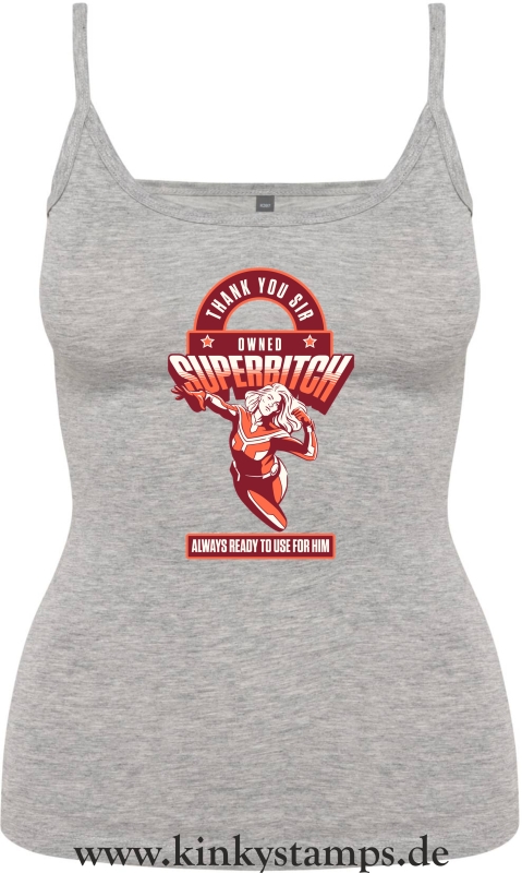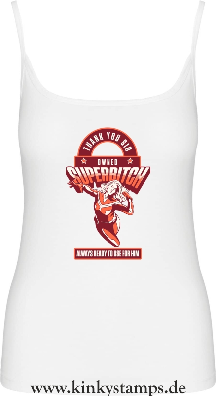 Dieses Damen-Träger-Top ist ein klares Statement für alle, die ihre devote Seite mit Stolz und einem frechen Augenzwinkern zeigen wollen. Der provokante Spruch „Owned Superbitch – thank you Sir“ wird durch das Motiv einer sexy Superheldin ergänzt, die zwischen den Textzeilen platziert ist. Ein Design, das Hingabe und Stärke perfekt miteinander verbindet.