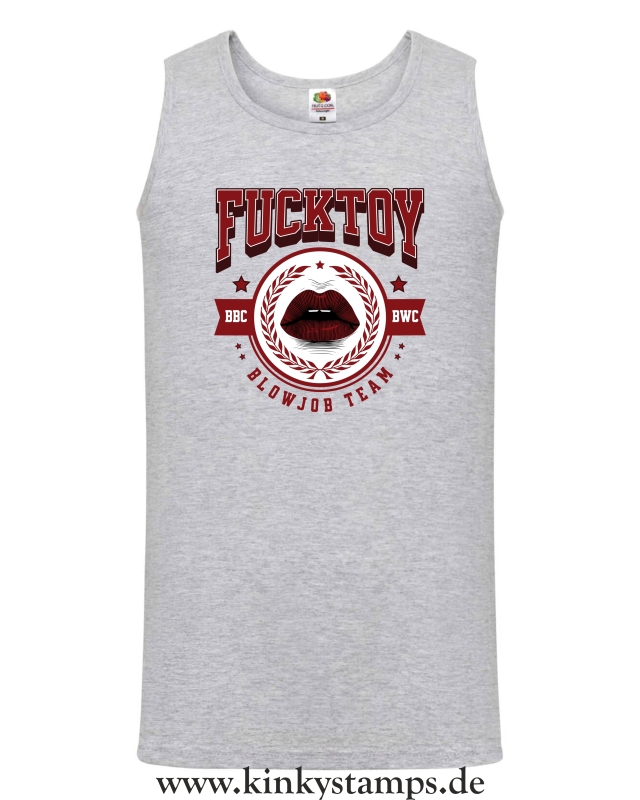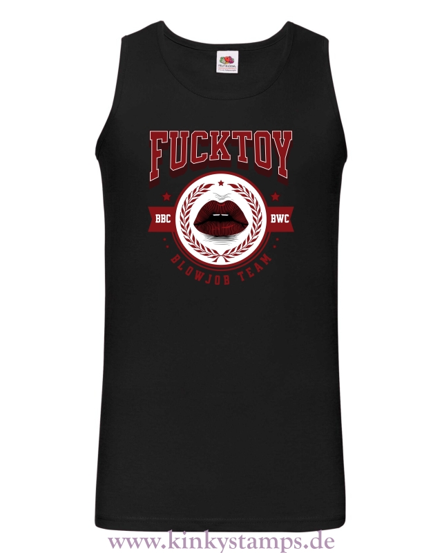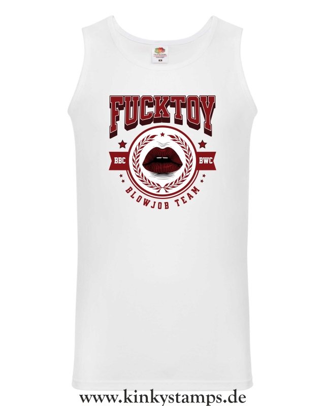 Dieses Herren-Tanktop setzt ein eindeutiges Statement. Der Spruch „Fucktoy - Team Blowjob“ ist im auffälligen College-Stil gestaltet und wird in der Mitte durch ein Mundmotiv ergänzt – rote, sinnlich geschminkte Lippen, die das Design sexy und provokant abrunden.