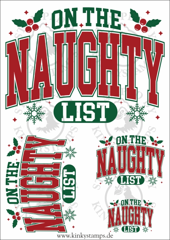 Mit diesem verspielten DTF Bügelmotiv zeigst du deine freche Seite zur Weihnachtszeit. Der Spruch „On the Naughty List“ ist im weihnachtlichen Design gestaltet und sorgt garantiert für Lacher und Aufmerksamkeit – ob als Motiv für Shirts, Hoodies, Tops oder als provokantes Geschenk im Advent.