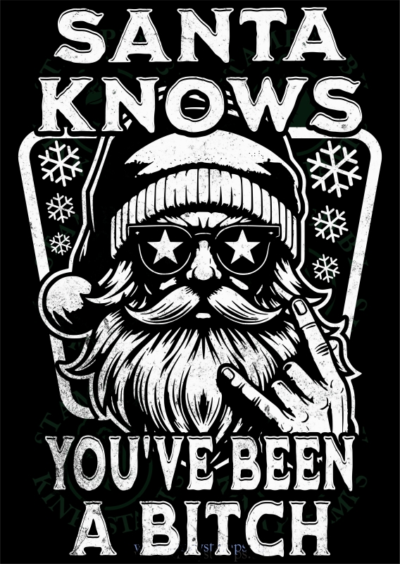 Mit diesem frechen DTF Bügelmotiv bringst du garantiert Schwung in die Weihnachtszeit. Der provokante Schriftzug „Santa knows you've been a Bitch“ wird von einem coolen Nikolaus begleitet, der lässig die Hand zum Rockergruß zeigt – ein Design zwischen Weihnachtsstimmung und rebellischem Kinky-Style.
